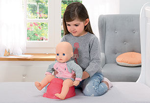 Baby Annabell’s latest craze is baby yoga. The sheep in its oversized jumper on her pink romper is already showing how to do the first exercise: stretch your feet, arms to the side at shoulder height, look relaxed … the little yoga expert has great fun when mummy or daddy starts moving her arms and legs. She giggles and laughs all the way through the asanas. To finish off, everyone does face yoga. For this part, Annabell is given her dummy, which she sucks on with realistic mouth movements and noises.