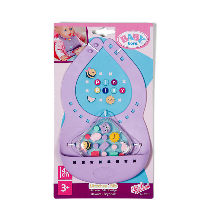 Baby BornCatalogue Number: ZAPF-837221The BABY born plastic bib is a creative toy that invites children to let their imagination run wild. With the different pins, which are known from the popular BABY born bathing shoes, the bib can be designed individually according to your own wishes. This practical accessory not only ensures cleanliness when feeding BABY born Emma, but also promotes children's creativity and dexterity in a playful way.