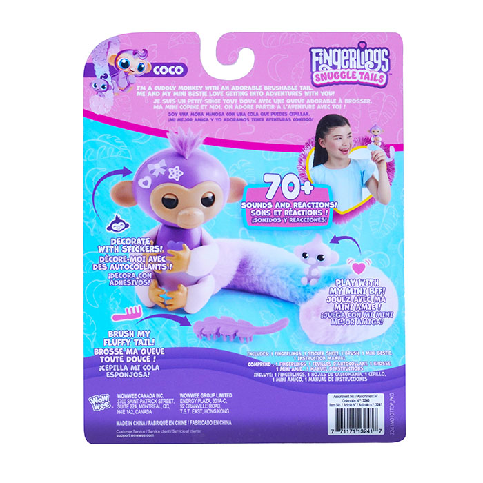 FingerlingsCatalogue Number: WO-3241Coco is my name and I love to express how I feel with cute monkey babble! I'm a purple monkey with a long fluffy snuggle tail. Meet my mini bestie Chloe - she's very cute and loves to play. You can wrap her up in my tail! You can also fluff up my tail with my brush and decorate me with stickers (included). Like all Fingerlings, I love to hang onto your finger and I'm curious about the world around me - watch me turn my head, blink my eyes, and respond to your touch with 70+ sounds & reactions! Age 5+