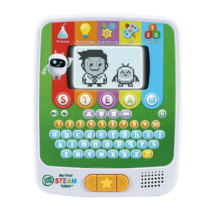 Full STEAM ahead! Young explorers can explore Science, Technology, Engineering, Art and Maths in this tablet packed with scientific learning activities. This tablet encourages young curious minds to develop scientific thinking. Animated characters Dr Frankensteam and SteamBot help kids discover simple science words and learn how to grow a seed from soil, water and sunlight! Learn about tools and their uses and build robots and machines by matching shapes to missing parts. Practise counting using dinosaur bones, magnets and test tubes, select different shapes to create spectacular animal artwork!