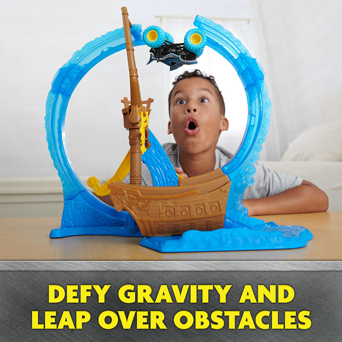 COMPLETE THE LOOP OF DOOM: Send your Megalodon die-cast truck soaring through a thrilling tidal wave loop. Watch your monster truck defy gravity, leap over obstacles, and reach the flag!