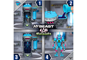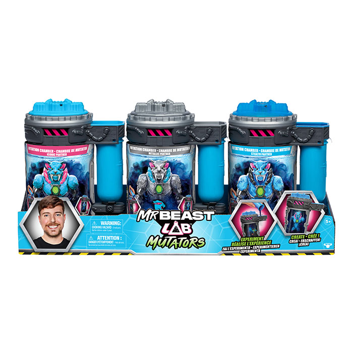 Introducing the NEW MrBeast Lab Mutators - Stealth Panther. Elevating the thrill of experimentation to a whole new level, kids now have the chance to Mutate Your very own MrBeast-inspired action figure. The MrBeast Lab Stealth Panther stands at 5.5" (13cm) tall, boasting over 20 points of articulation and crafted to incorporate MrBeast's signature blue with a translucent finish. To create the MrBeast Lab Stealth Panther, simply add the mutation liquid to the chamber, press the fingerprint scanner, and watch as your panther reveals itself and is brought to life. There are three MrBeast Lab Mutators to collect, including: Iconic, Stealth, and Metallic. Perform the experiment, reveal your Stealth Panther, and let the extraordinary adventure commence with the NEW MrBeast Lab Mutators.